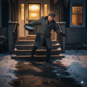 The scenario is familiar to many people in colder regions. A front walkway is partially cleared but still slick with ice. Only one handrail lines a short set of steps. No salt or ice melt has been applied to improve traction. What looks manageable in daylight becomes dangerous at dusk.