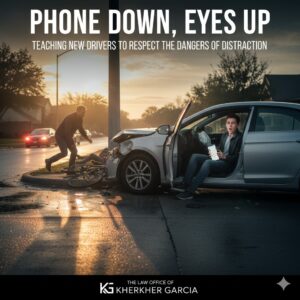 Phones can wait, but lives cannot, and every moment of attention matters on the road. Teaching new drivers to stay focused helps prevent accidents and protect themselves and others. If a crash does happen, the law office of Kherkher Garcia is there to guide injured drivers through the legal process and fight for the compensation they deserve.