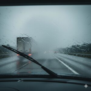 This mist is much harder to clear than raindrops. Standard rain falls in distinct droplets that gravity pulls off your windshield, but road spray is a suspension of tiny particles that cling to the glass. To make matters worse, this spray is rarely clean water. It is a cocktail of motor oil, road grime, salt, and tire particles. This oily mixture creates a smeary film that catches the light from oncoming headlights, creating a “white out” effect that makes it impossible to see the brake lights of the car in front of you.